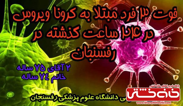 معاون درمان دانشگاه علوم پزشکی رفسنجان از مرگ دو آقای ۷۵ ساله و یک خانم ۷۴ ساله مبتلا به کرونا ویروس در این شهرستان خبر داد.