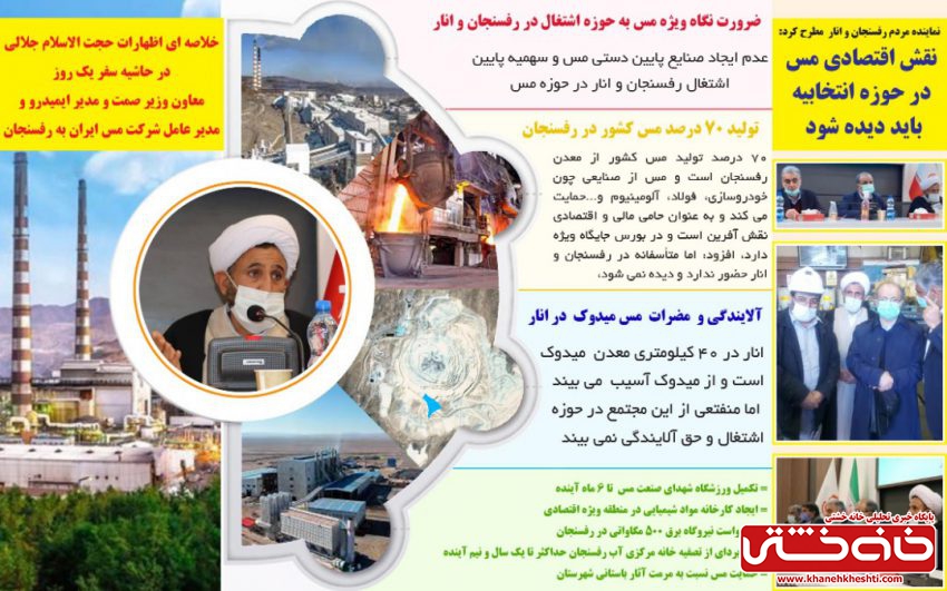 نماینده مردم رفسنجان و انار در مجلس شورای اسلامی با بیان اینکه ۷۰ درصد تولید مس کشور از معدن رفسنجان است و مس از صنایعی چون خودروسازی، فولاد، آلومینیوم و…حمایت می کند و به عنوان حامی مالی و اقتصادی نقش آفرین است و در بورس نیز دارای جایگاه ویژه ای می باشد، افزود: متأسفانه در رفسنجان و انار حضور پررنگ نمی باشد، لذا در آن جلسات این موضوع را به مسئولان و مدیران تبیین نمودم.