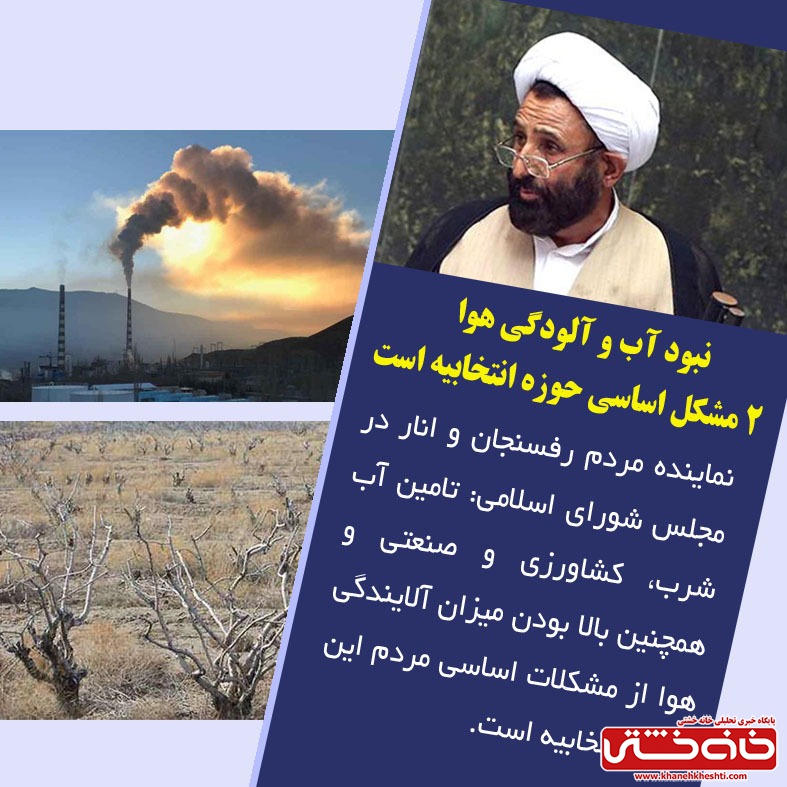 نماینده مردم رفسنجان با اشاره به اینکه مقادیر فراوانی ماده آرسنیک که برای سلامتی بسیار مضر است در آب این شهرستان وجود دارد، عنوان کرد: مشکل آب در حوزه انتخابیه بنده فقط مربوط به کشاورزی نیست بلکه ما هم مشکل تامین آب شرب و آب صنعتی را نیز داریم.