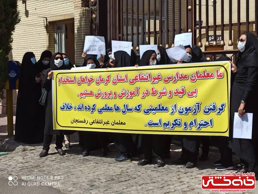 به گزارش خانه خشتی، صبح امروز جمعی از معلمان غیرانتفاعی رفسنجان مقابل فرمانداری این شهر تجمع داشتند.