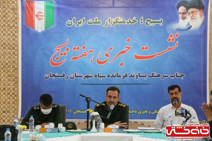 به گزارش خانه خشتی، سرهنگ محمد پساوند پیش از ظهر امروز در نشست خبری هفته بسیج در هتل جهانگردی رفسنجان ضمن گرامیداشت هفته بسیج برنامه های این هفته را تشریح و اظهار کرد: برگزاری رزمایش امر به معروف، افتتاح ۴ پایگاه مقاومت بسیج، تجلیل از خانواده شهدا، نمایشگاه خدمات بسیج و دیگر برنامه ها در این هفته اجرا می شود.